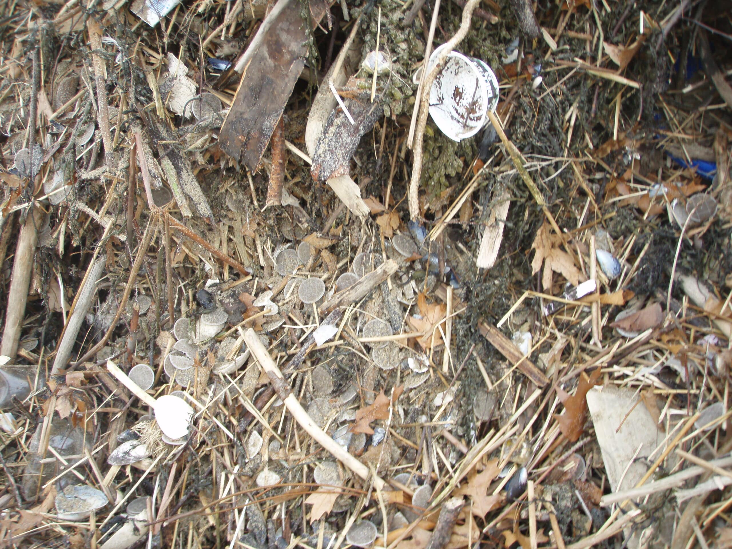 - Caps, tear-off tabs, foil bits, confetti, small shell pieces