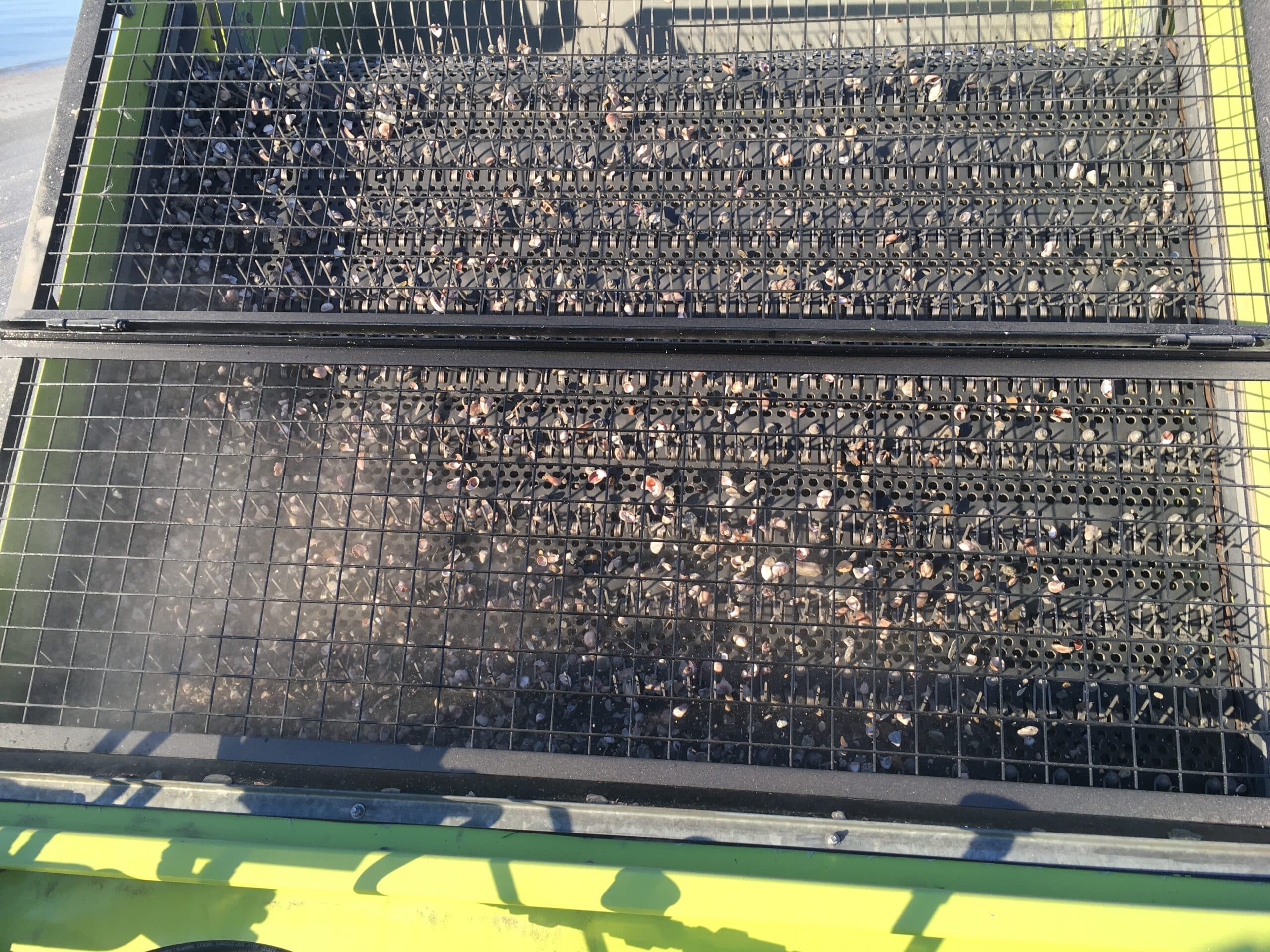 No. It uses spring tines feeding a perforated conveyor belt—not a vibrating sifter screen—so it doesn’t clog the way screens can in damp, seaweed-heavy conditions. The tines lift the debris from the sand and deflect it onto the moving conveyor, where it pinballs between tines, knocking off sand, which falls back to the beach through the perforations.